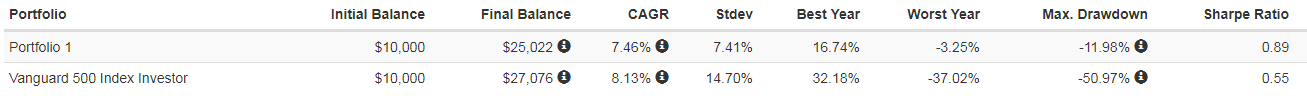 완전한 우상향은 아니지만, S&P500지수에 비해서 변동성이 훨씬 덜하다는 것을 알수 있죠?